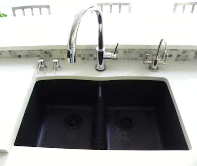 While replacing the countertops with quartz, we also got two soap dispensers, one for hand lotion and one for soap. We also replaced the hot water dispenser with one which dispenses both hot water and cool water. We replaced the steel sink, which showed scratches badly, with a composite granite sink which has been a big improvement. Just before the remodel we replaced the kitchen faucet with a faucet you can touch anywhere to turn it on/off. This is very handy when your hands are covered in gunk. |