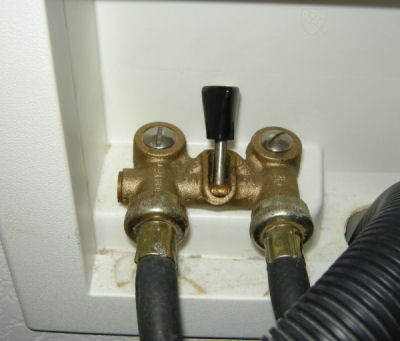 | In our house, the washer is in a corner and the builder wisely put the water outlets in the side wall where they can easily be reached. He also installed a single lever shut-off valve to make it eash to turn the water off and on. | ![]() |