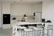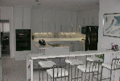 2008 Update: The white Corian has held up fine and not been a problem at all. If you look at the pictures at the top of this page, you will see that our kitchen was originally all white, which in retrospect was probably too much. When we recently had it repainted, we got the cabinets painted gray and also had a tile backsplash installed to break up the white.