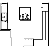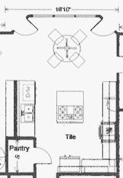 When we met with Breshears, we spent quite a bit of time at his computer fine-tuning the design and layout of the cabinets. For starters, we had put the built-in oven in the middle of one wall of cabinets. This was not desireable because the top of the oven cabinet sticks out farther than the tops of the surrounding cabinets. I had placed the oven in the middle because I thought it should be close to the cooktop, sink and refrigerator. |
