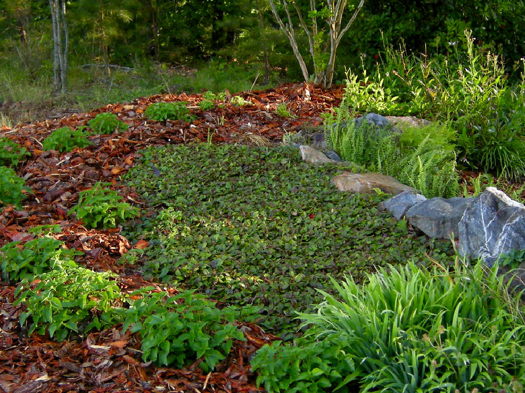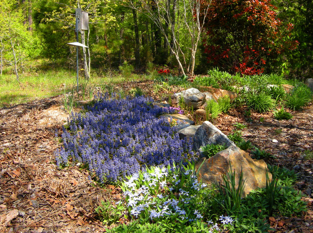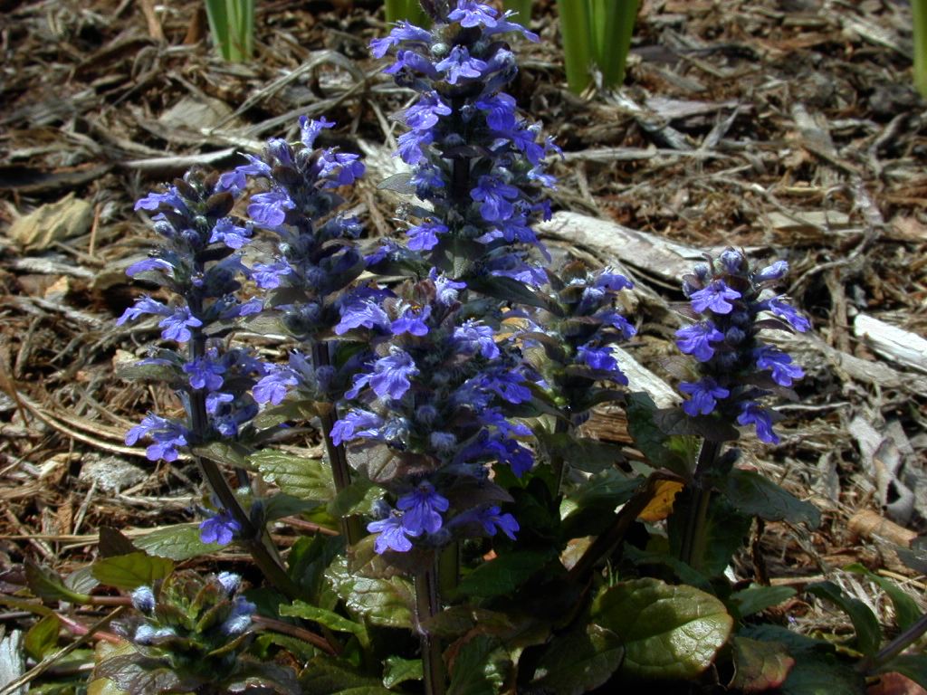 Online nurseries charge $10 or more for a single Ajuga plant. When the side lot street bed was built, we dug up some ajuga from places they were growing in droves and planted them along the front of the street bed. They took root and started blooming almost immediately.