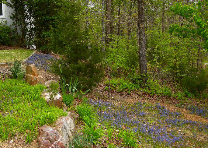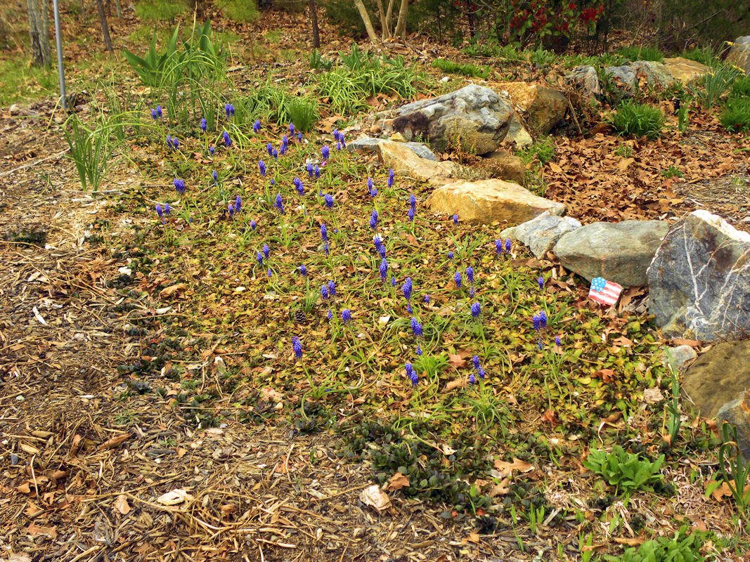 Grape Hyacinth flowers look very similar to the Ajuga flowers, so we planted some bulbs among them.