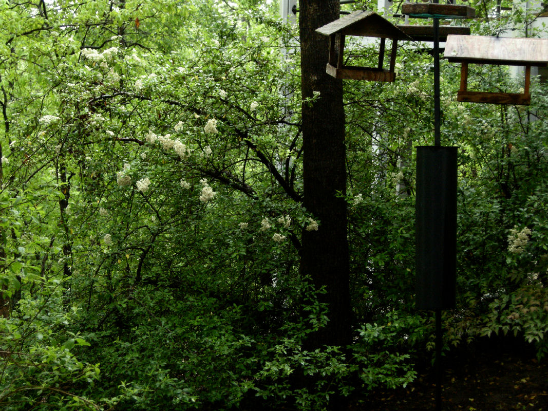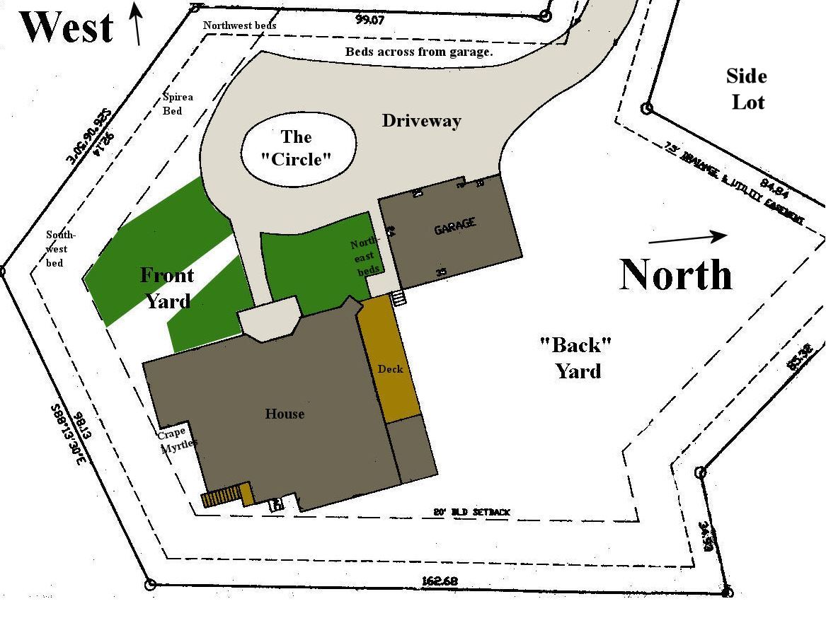 is what we call the back yard. Move the cursor around the picture below for names of plants and click for pics and more info.