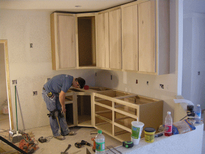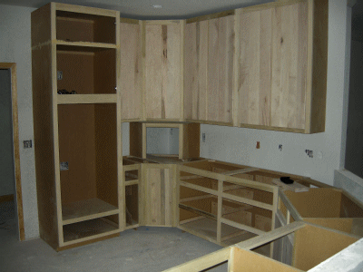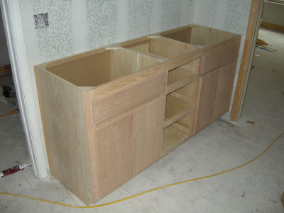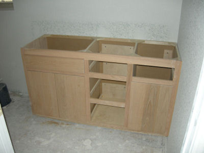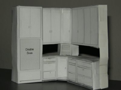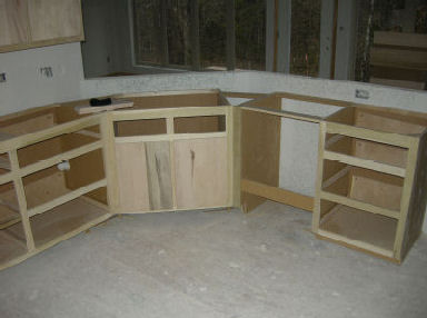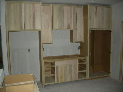 In the pictures above, you can see that the cabinets just to the right of the oven cabinet are about half the size as in my drawings and model. One reason is that the oven cabinet was pushed over several inches to make room for the light switches. That could have been avoided by putting the switches on the other side of the wall, just outside the door, but I didn't think of it when we were placing switch boxes.
