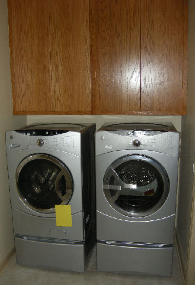 If you know from the start that you are going to have a front loading washer and dryer, you should be aware that normal overhead cabinets will be hard to reach because front-loaders are deep. And they are usually mounted on bases which makes getting to cabinets set back above them even harder. (Not having the bases will involve a lot of bending over, which is not a pleasant option for those of us of a certain age.)