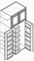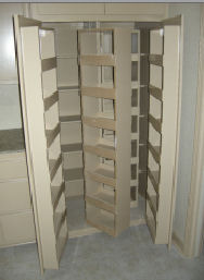 The cabinet builder said that we didn't have enough space to build a walk-in pantry with an angled door the way I had it planned. This was my second big design flaw. This time the cabinet builder saved me by suggesting the kind of pantry seen below. The front set of shelves swings out for access to the back set, and more shelves line the inside of each door: