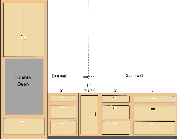The other reason is that the cabinet builder widened the corner cabinets and appliance garage to make them more accessible. The resulting narrow base cabinet has a vertical divider in the middle because we decided to use that space for storage of cookie sheets, serving trays, etc. The narrow drawer above it will be good for pot holders, etc.