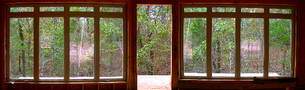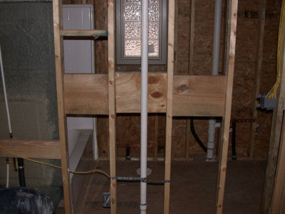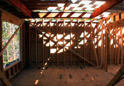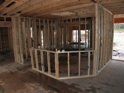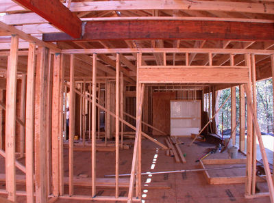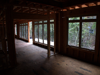 The windows above face due West, right into the afternoon sun. Ordinarily, this would be a bad thing for most of the year because of the heat and light coming in, but about 15' behind the house are a lot of tall tress which will block most of the sun during the warm months, but which will let heat into the house during the cold months when the trees lose their leaves. Without the trees, it would be better to find a lot where these windows would face North. If the windows faced South, you could have wider than normal eaves to block the Summer sun and let in the Winter sun. If you have a patio or deck out back, you could cover it to block the Western sun, but that will make the house darker all the time. In our house, we added tint to windows on the West side, which helps some. In Judy's house, we specified windows with Low-e and very low (.30-.32) heat gain (SHGC) and heat loss (U-factor) ratings. A low VT rating means that not as much light gets through because the windows have a tint built in (as opposed to applied in a sheet); we didn't specify low VT, but Buss apparently did because we can tell by looking that they have some tint to them, which will reduce glare. A low U-factor (heat-loss rating) is particularly important with a lot of windows because you will lose a lot of heat through them during the cold months. Window coverings help, but kind of defeat the purpose of having the big windows in the first place. While on the subject of the wall of windows -- something I didn't know to specify, but which Buss did, was to make the window-wall studs 2x6 rather than 2x4 like the rest of the house. The reason is that the windows do not provide any structural support. In addition to the 2x6s, a large header board runs the length of the 28-foot wall of windows, plus in the picture above, you can see that on either side of the door are FIVE 2x6 studs. The electrician actually had to carve out a space to put the light switches by the door. Folks, this is a SOLID house!