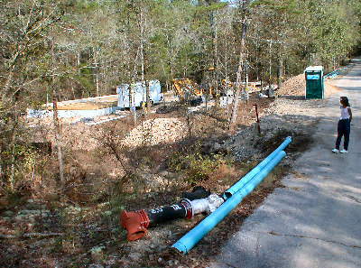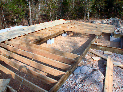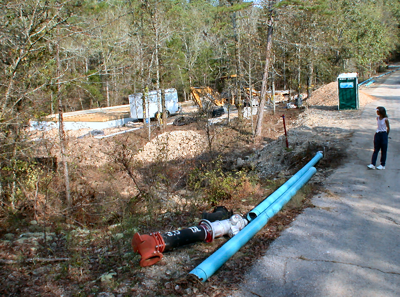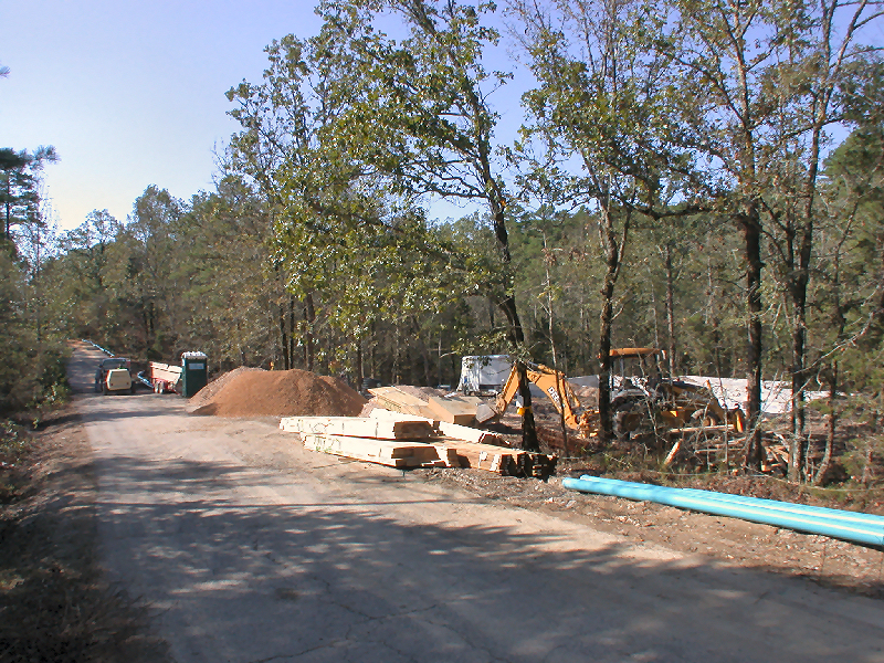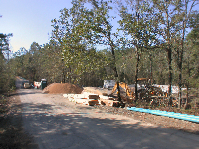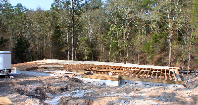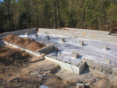 Sept. 28, 2007: The foundation walls have been completed. In the back-left corner, you can see where an opening was cut for a door for access under the floor. The part of the foundation in the front where the dirt is piled up is where the slab will be poured for the front porch. The reactangle of foundation walls at the back will be filled in with dirt and a slab poured on top for the back patio.