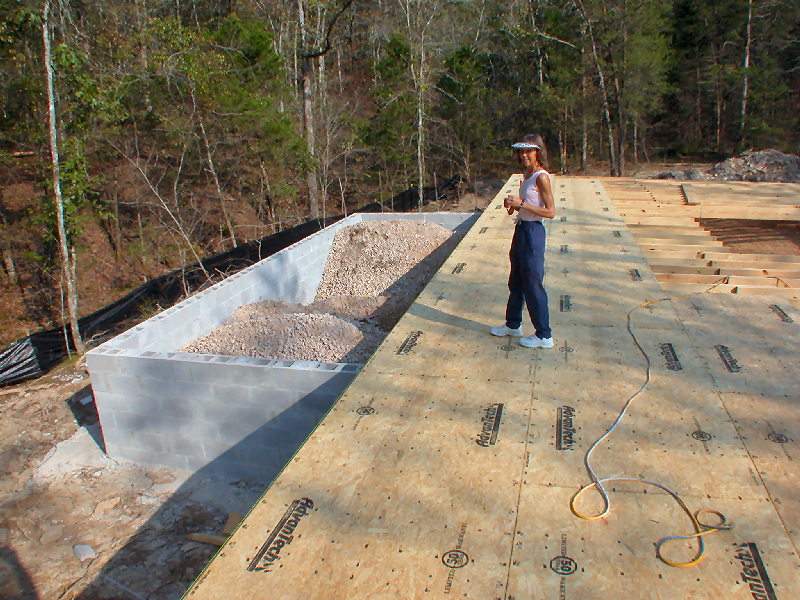 The plastic/poly sheeting seen inside the foundation helps prevent moisture from coming up from the ground and through your flooring. Ideally, the poly should be sealed to the foundation walls to keep moisture from coming up around the edges, though I have never heard of a builder around here actually taking this step. At Judy's house, we had a layer of poly put on the subfloor before the carpet padding went in, which should protect the carpet and padding from moisture below. For more about foundations, click here.