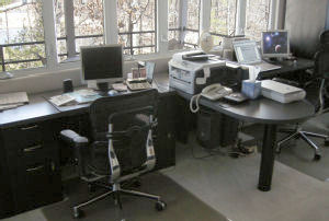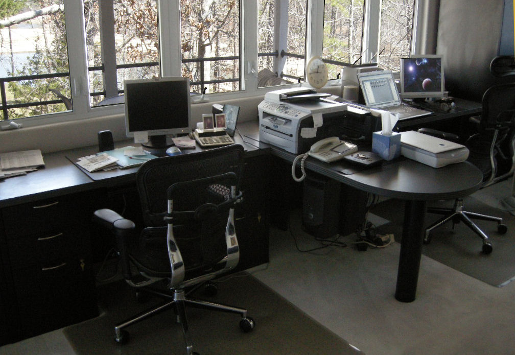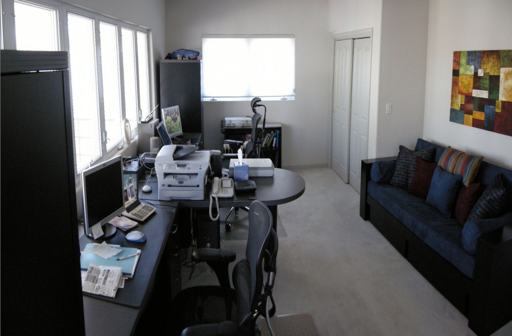 We originally had the study off of the living room, but in trying to reduce the size of the house, we decided to get rid of the separate study and make a study out of one of the guest bedrooms with a sleeper sofa in it for company. (Upper-left corner of floor plan.)