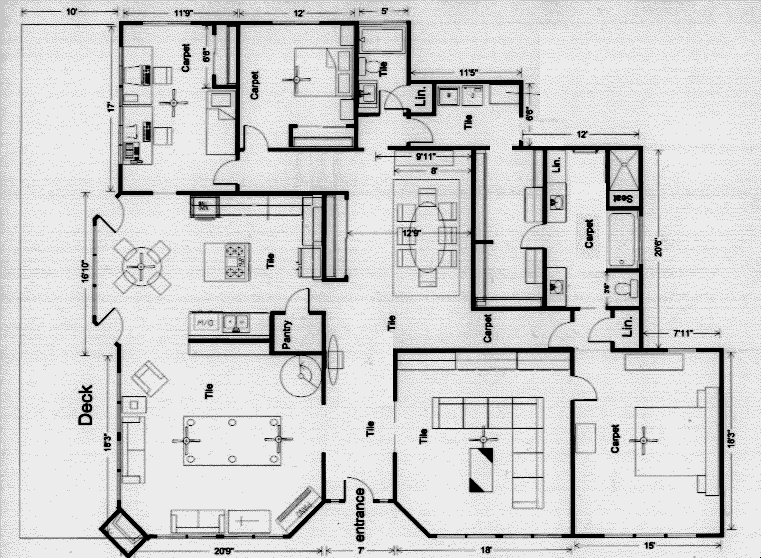 Another alternative is to use a graphics program on your computer to draw a rough floorplan. Don't forget to allow for the approximately 4" thickness of walls. I did Judy's floor plan this way (using Paint Shop Pro) because I was modifying an existing plan rather than designing a plan from scratch, but it was a great deal more trouble than using floor plan software. (My old software would not run on the current version of Windows.) While the printout looks better and is easier to modify than a hand drawing, it will NOT be completely accurate. Expect the final blueprint to be different due to things like rounding room dimensions, etc.