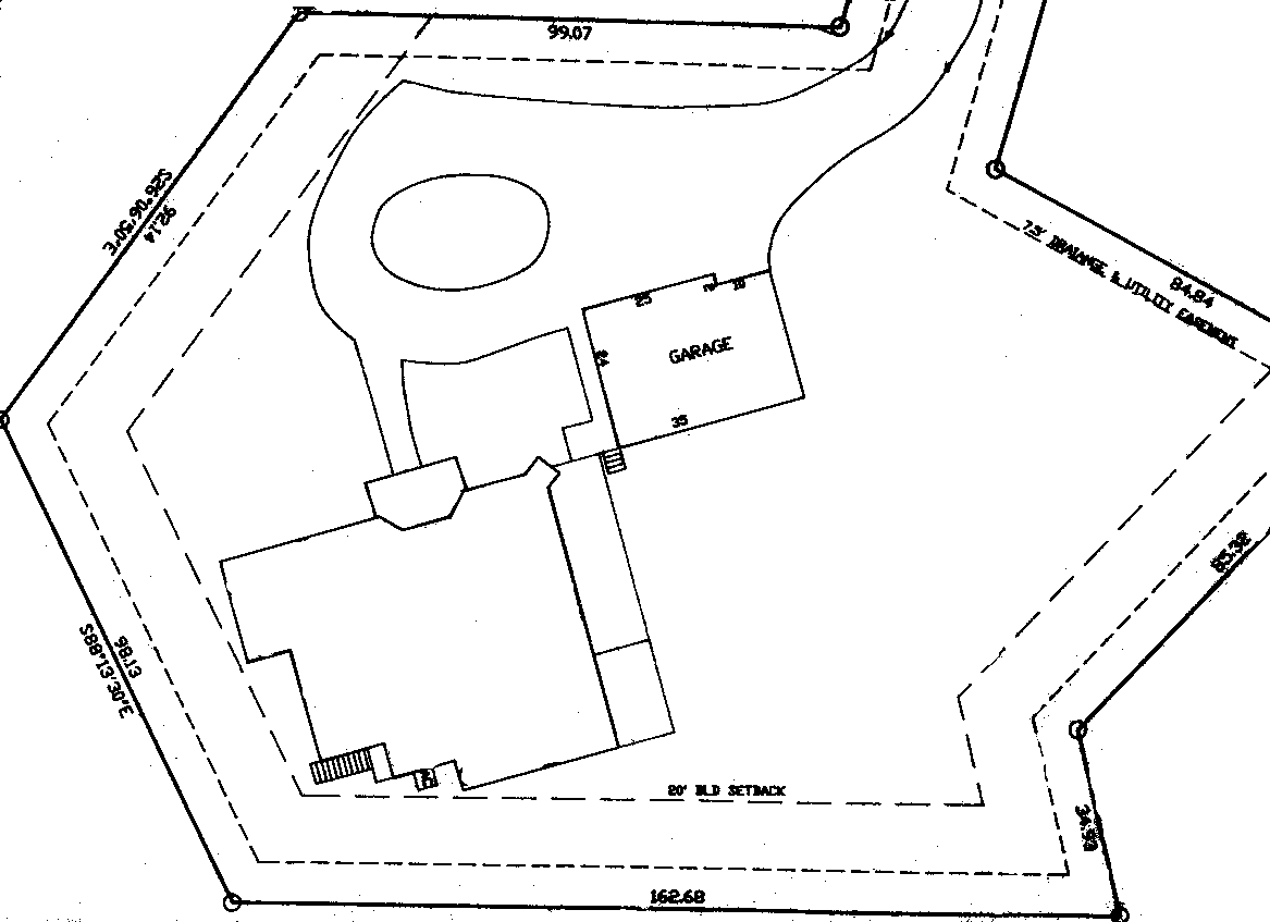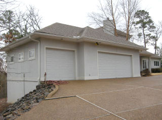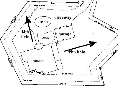 SizeThe plan I drew up called for a 2-car garage, but our builder changed it to a 3-car garage (for golf-cart storage) and we were very glad he did. Although we have never had a golf cart, we have had no trouble filling up that extra space with kayaks, bikes, storage cabinets, exercise equipment, etc. At least a half-dozen houses in our neigborhood (Isabella) which were built with 2-car garages have had a third bay added on for their golf carts. Naturally, it's cheaper to get that third bay to start with. Craft also made the garage deep enough for us to put storage cabinets in the back. Adding a few feet to the length of a garage is a relatively inexpensive option and one that you will probably never regret. ExtrasWe did not get storage cabinets built into the garage, which turned out to be a mistake on my part. When we finally went shopping for them, we found that they are big and heavy, making them difficult to transport, and are not a lot of fun to put together. They are also pretty pricey compared to getting cabinets built in during construction when they can be made up of studs, sheetrock, and plywood shelving. So in Judy's floor plan, I specified a storage closet built into the back of the garage. To the left of the closet, just outside the laundry room door, is space for an upright freezer. To the right of the closet is where the water heater is located. A "people door" is another feature to consider. In our house, we placed it where we could exit the garage right by the deck steps and on into the house. In Judy's, the door is on the right side of the garage so that if Judy is working out in that area or needs to get to the breaker box, which is just out that door, she doesn't have to go through the front or back door or through the garage door. Finishing the garage floor with an epoxy coating is another popular option. It protects the concrete from oil and other stains and makes it easy to clean, plus it looks better than bare concrete. An external pad on the garage door frame for activating the door opener is a must. Even with a walk-in door, we use the access pad frequently. The biggest change I would make if I could go back in time would be to put the garage under the house where the lot slopes down. At the planning stage, we had no idea how much the lot sloped. It would still have taken some excavation, but the cost of building a 3-bay garage as a separate structure with stucco exterior walls has to have been the most expensive, and least convenient option. With a fraction of the money saved by putting the garage under the house, we could have added an elevator from the garage up to the den and on up to the loft. Garage LocationBecause our house is 200' back from the street, we didn't have to worry about the house facing the street, so we turned it so that it had a front view down one golf hole and a side down another golf hole. To maximize the views, we pushed the house as far as possible back against two of our lot's boundaries, as seen below. If we had attached the garage either to the front or side of the house, we would have lost a substantial percentage of our view, so we made it detached. (Should have put it UNDER the house, but hindsight is 20-20.) Most people will have houses facing the street with a garage extending from one end or the other, such as in Judy's plan: