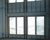 First the studs are sheathed with oriented strand board and then covered with a vapor barrier. Then the concrete boards are nailed over that. |